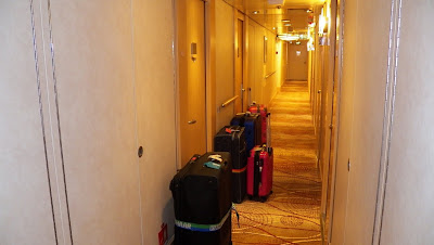 endlich sind wir da - wir steigen aus, sammeln unser Gepäck ein und geben es auch gleich wieder bei den Mitarbeitern ab, die in ihren hellblauen Shirts und weissen Stoffhandschuhen parat stehen, um sich weiter darum zu kümmern. Wir werden die Koffer dann im Schiff bei unserer Kabine wieder sehen.